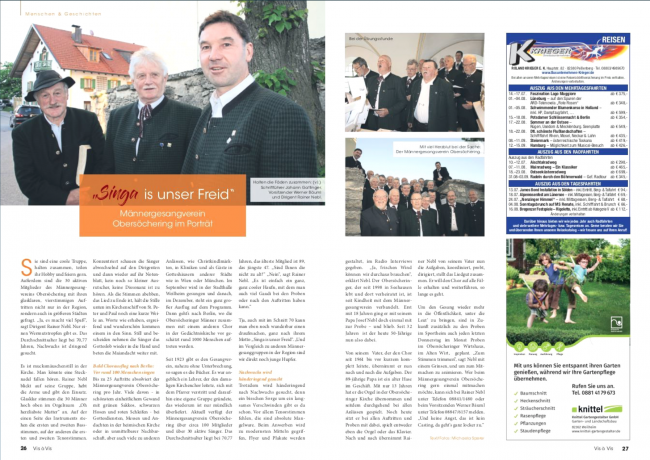 Das Vis à Vis Magazin mit einem Portrait des MGV Obersöchering “Sie sind eine coole Truppe, halten zusammen, teilen ihr Hobby und feiern gern. Außerdem sind die 30 aktiven Mitglieder des Männergesangvereins Obersöchering mit ihren glasklaren, vierstimmigen Auftritten nicht nur in der Region, sondern auch in größeren Städten gefragt.” Lesen Sie den gesamten Bericht, ab…